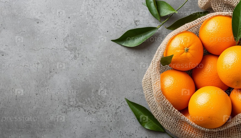 Апельсины в сетке на минималистическом фоне с копировальным пространством