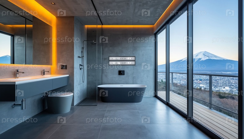 Ванная комната в японском стиле с панорамным окном и видом на гору Фудзи