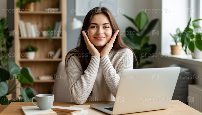 Счастливая молодая девушка или студент сидит перед ноутбуком Удаленная связь, работа или учеба через Интернет