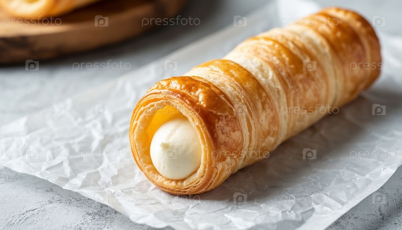 Кремный торт из труб на белом деревянном фоне