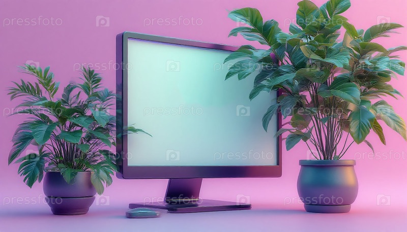 Монитор с пустым экраном на рабочем столе с монитором для горшечных растений