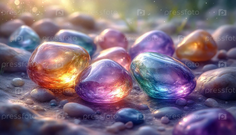 Радужные стеклянные камни на лесной тропе