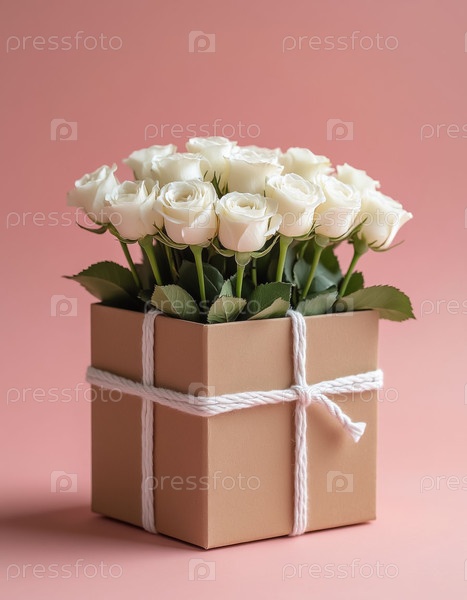 Kraft Box заполненная белыми розами на розовом фоне Eco