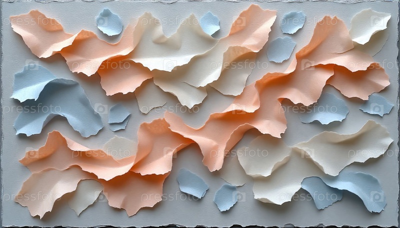 Разорванные бежевые и синие остатки ткани на пастельном минималистском фоне