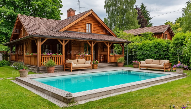 Небольшой деревянный коттедж с открытым бассейном во дворе