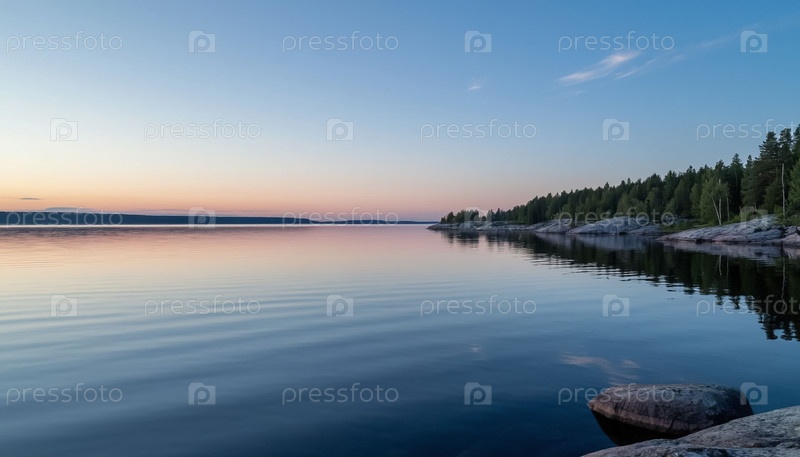 Озеро в Скандинавии - гладкая вода и большие валуны на берегу