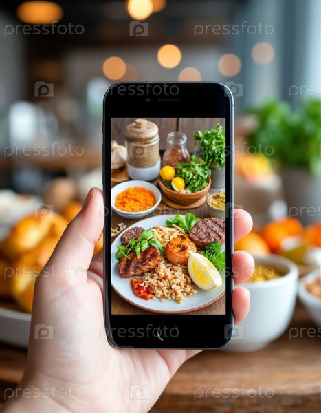 Рука держит смартфон, отображающий натюрморты пищи