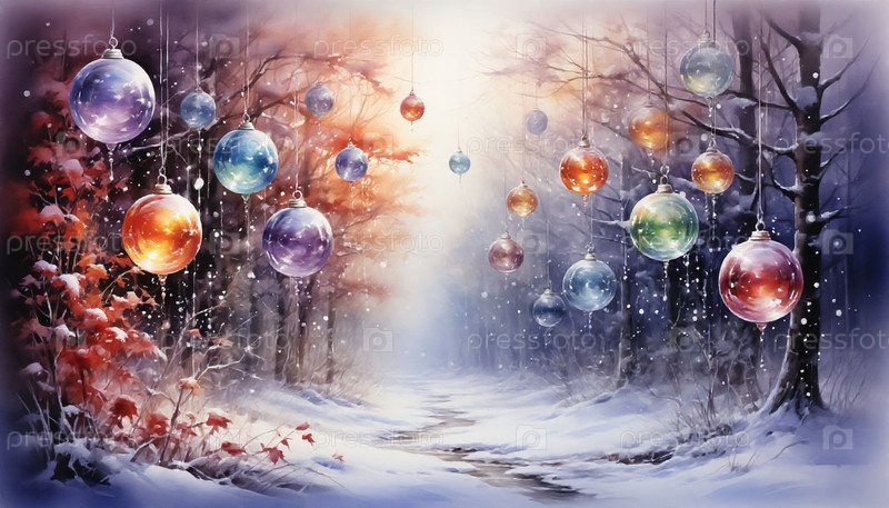 Идиллическая иллюстрация праздничных стеклянных шаров на тропе в снежном лесу