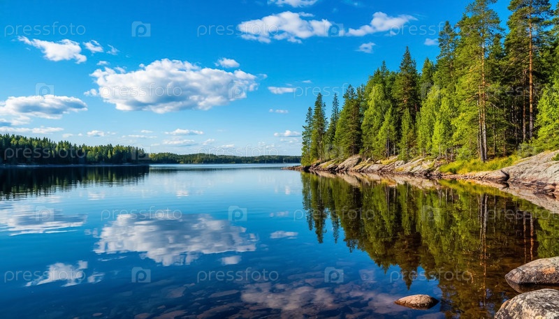 Большое лесное озеро в ясный летний день