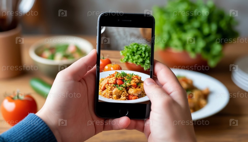 Рука держит смартфон, отображающий натюрморты пищи