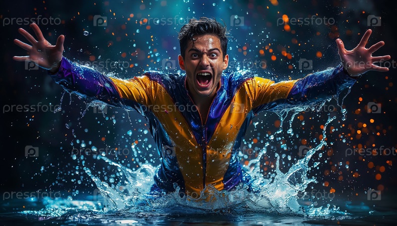 Мужчина в оранжево-синем костюме прыгает из воды, руки вытянуты динамично