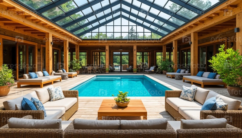 Роскошный деревянный коттедж с террасой и открытым бассейном во дворе