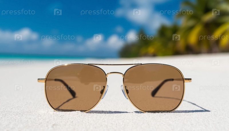 Поляризованные солнцезащитные очки авиатора на белом песчаном морском пляже