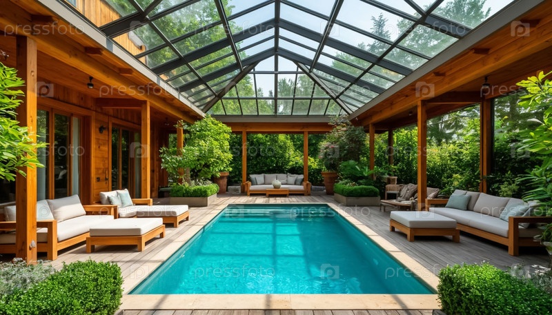 Роскошный деревянный коттедж с террасой и открытым бассейном во дворе