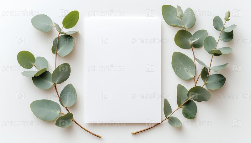Пустой пустый макет на белом столе с ветвями эвкалипта