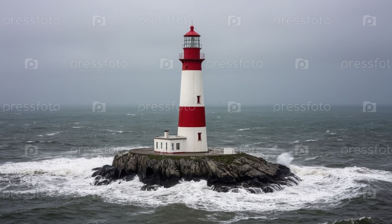 Морской маяк на одиноком острове посреди океана в тумане