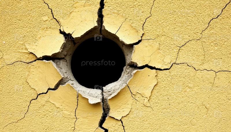 Желтая штукатурка трещины в стене с отверстием