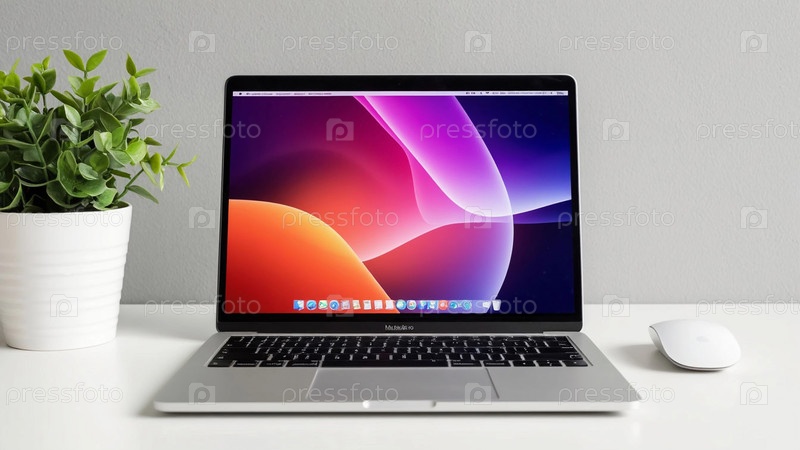Ноутбук с абстрактным экранщиком на мониторе на минималистическом белом фоне