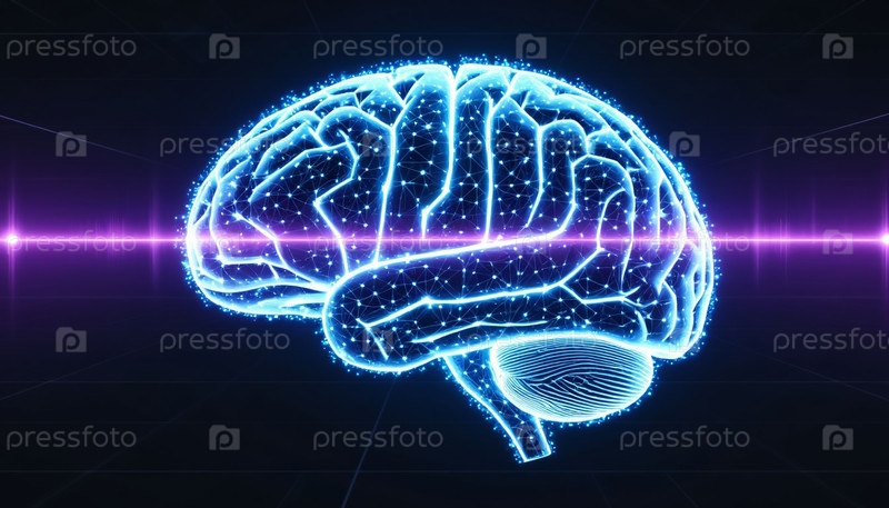 Человеческий мозг состоит из светящихся блокчейн-узлов на темном фоне