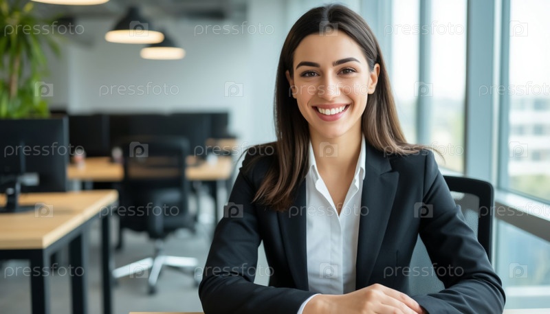 Деловая женщина молодая за компьютером в офисе, счастливо улыбающаяся