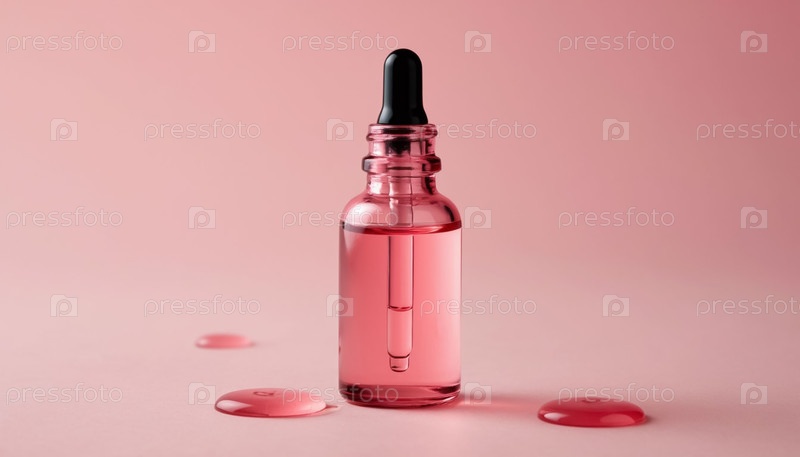 Розовая стеклянная бутылка с маслом для лица с пипетой на пастельном фоне