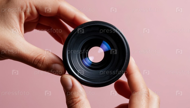 Руки, держащие объектив камеры Розовый фон