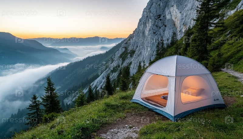 Туристическая палатка в горах, прозрачная, туманное утро и восход солнца над горами.Концепция отдыха и путешествия