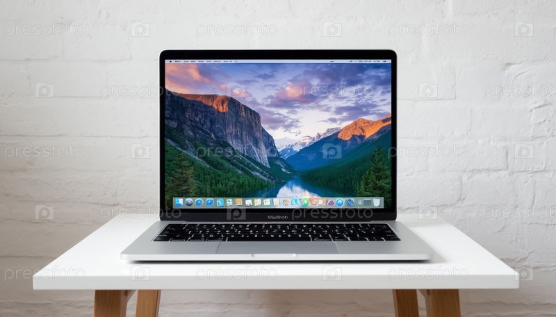 Ноутбук с абстрактным экранщиком на мониторе на минималистическом белом фоне