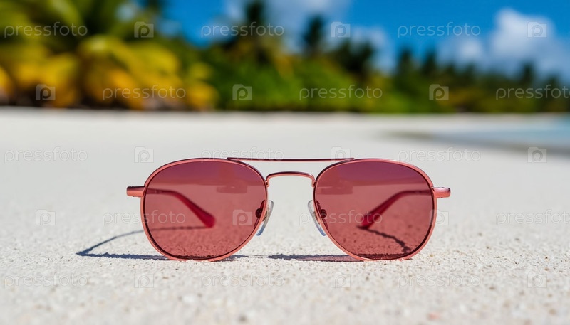Розовые поляризованные солнцезащитные очки авиатора на белом песчаном морском пляже