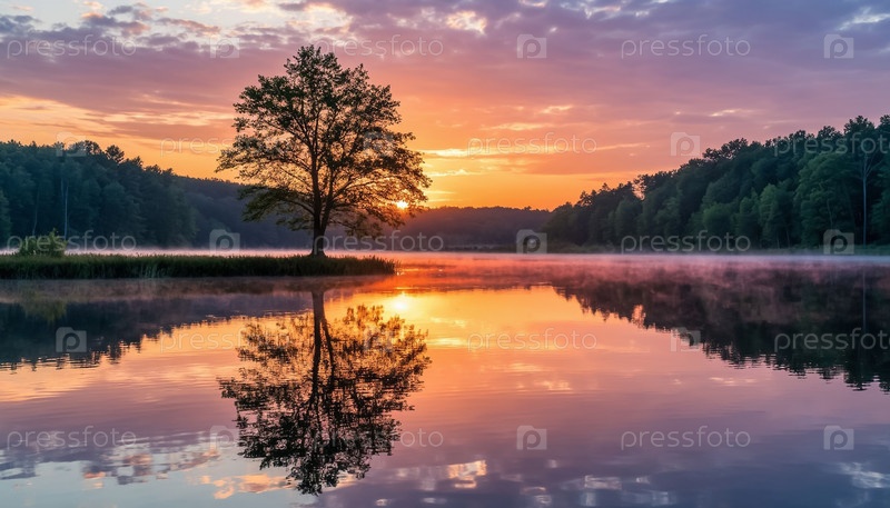Отражение дерева в воде на закате.Прекрасный пейзаж