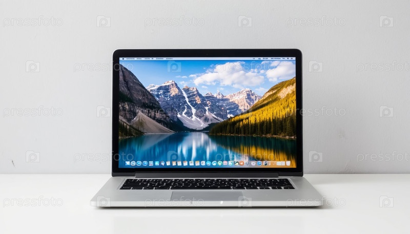Ноутбук с абстрактным экранщиком на мониторе на минималистическом белом фоне