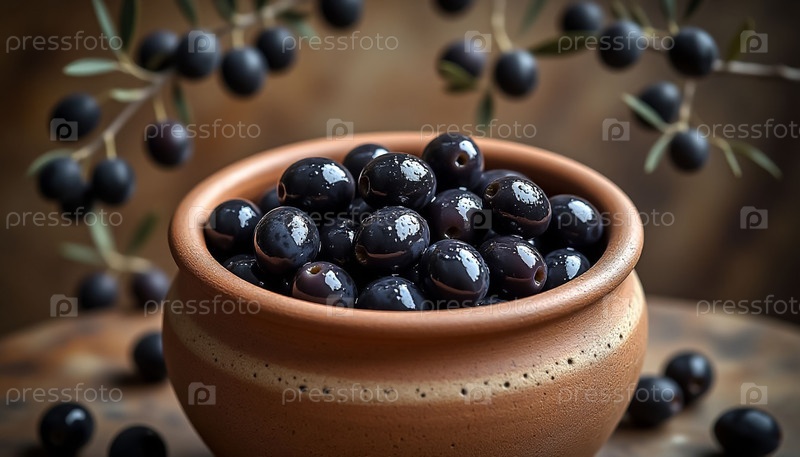 Элегантный глиняной кувшин с черными оливками