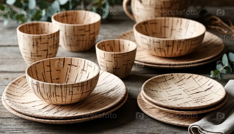 Экологически чистые посуды из березовой коры на столе