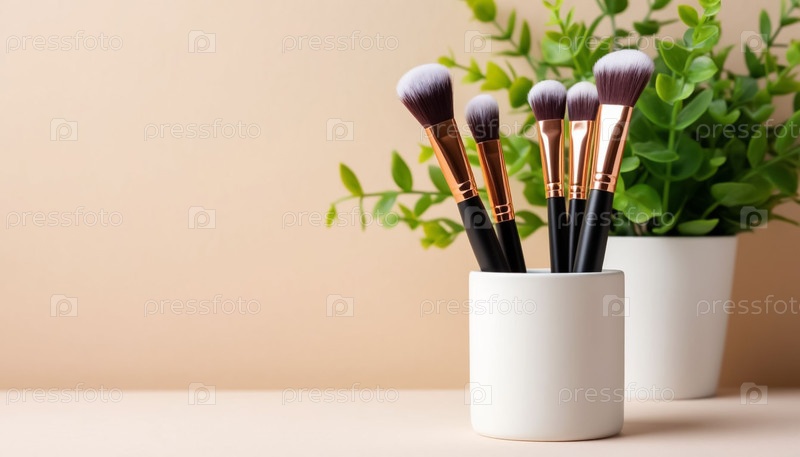 Макияжные кисти в стакане на пастельно-бежевом фоне