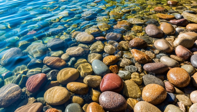 Радужные гладкие гальки под чистой водой top view