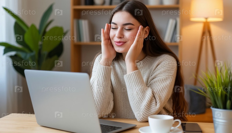 Счастливая молодая девушка или студент сидит перед ноутбуком Удаленная связь, работа или учеба через Интернет