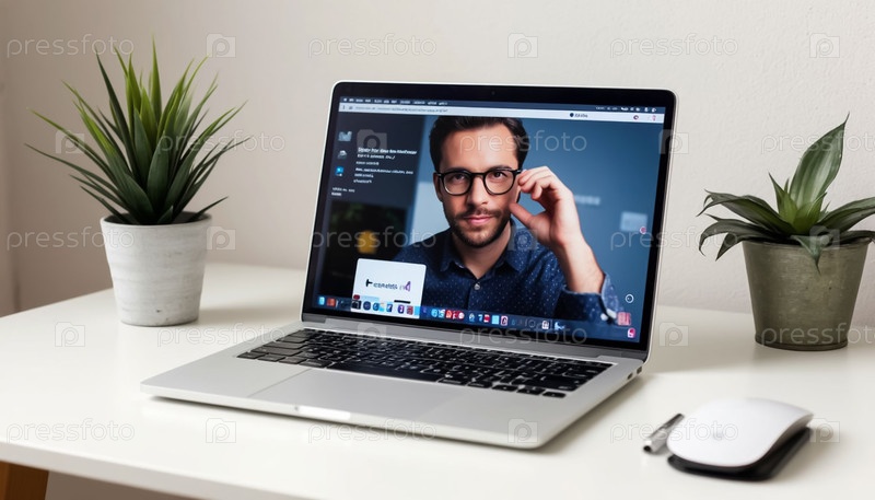 Ноутбук с рабочей страницей на мониторе на минималистическом белом фоне