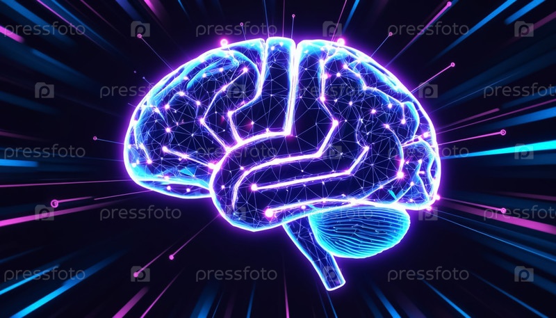 Человеческий мозг состоит из светящихся блокчейн-узлов на темном фоне