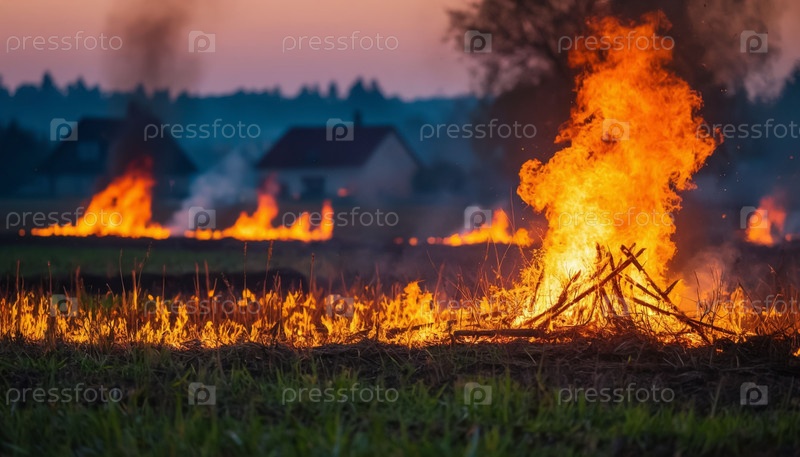 Горящее поле в жаркое лето, пламя приближается к деревне