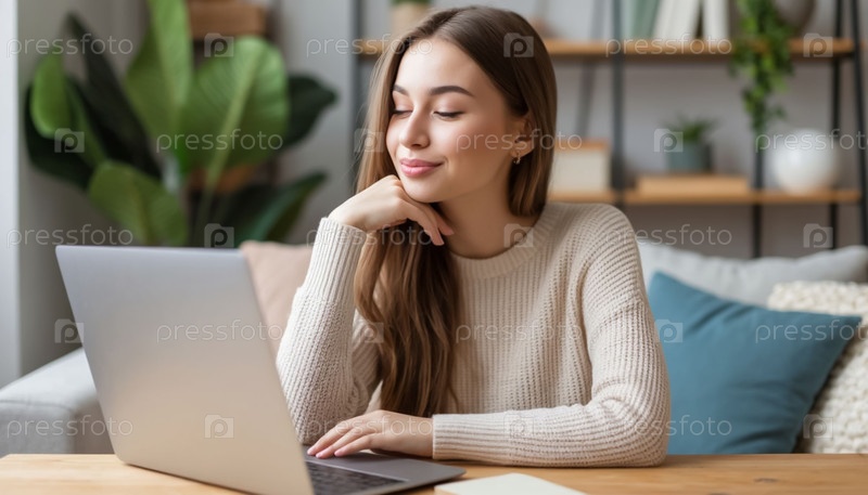 Счастливая молодая девушка или студент сидит перед ноутбуком Удаленная связь, работа или учеба через Интернет