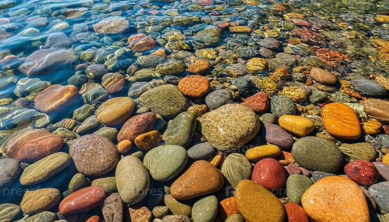 Радужные гладкие гальки под чистой водой top view