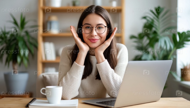 Счастливая молодая девушка или студент сидит перед ноутбуком Удаленная связь, работа или учеба через Интернет