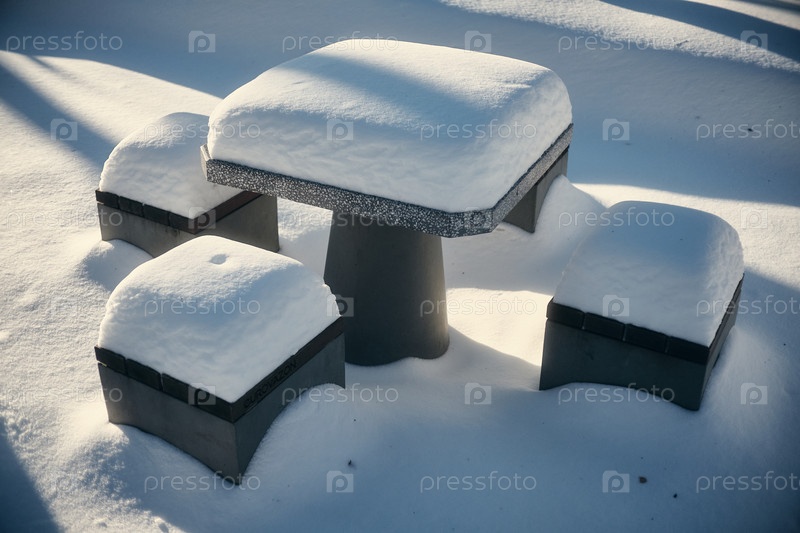 Каменный стол и табуетки завалены снегом