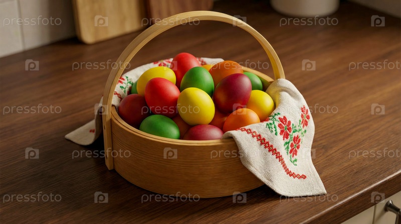 Цветные пасхальные яйца в деревянной корзине на деревянном столе