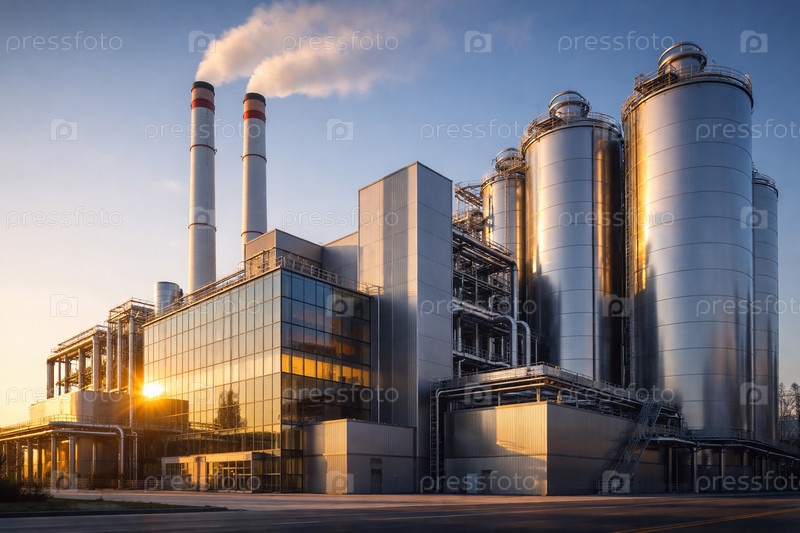 Современный производственный комплекс с крупными полированными стальными силосами для хранения, стеклянным административным корпусом и высокой дымовой трубой на фоне чистого неба, просторная зона разгрузки и инженерные коммуникации