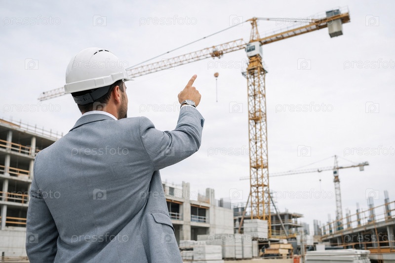 Прораб в белой каске у бетонного каркаса многоквартирного дома указывает на башенный кран на строительной площадке — инспекция проекта и контроль строительных работ