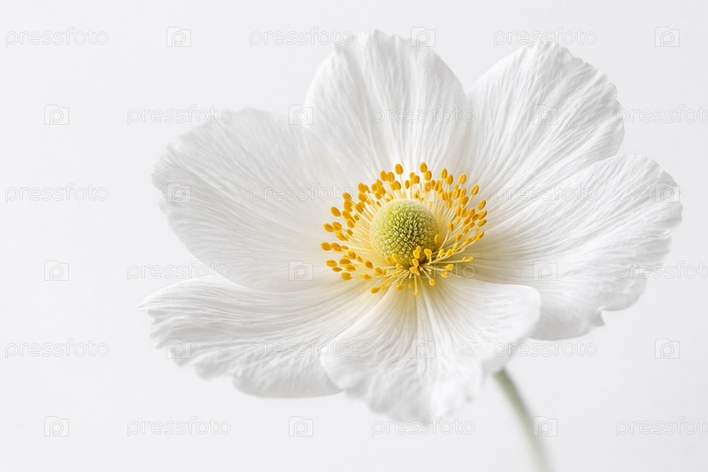 Макрофотография белой анемоны на светлом фоне — крупный план нежных тонких лепестков и яркого желтого центра с тычинками