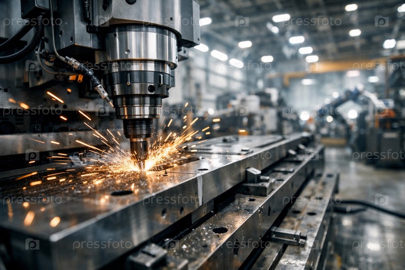 Фрезерная обработка металлической заготовки на станке с ЧПУ — искры и стружка при прецизионной металлообработке в промышленном цехе