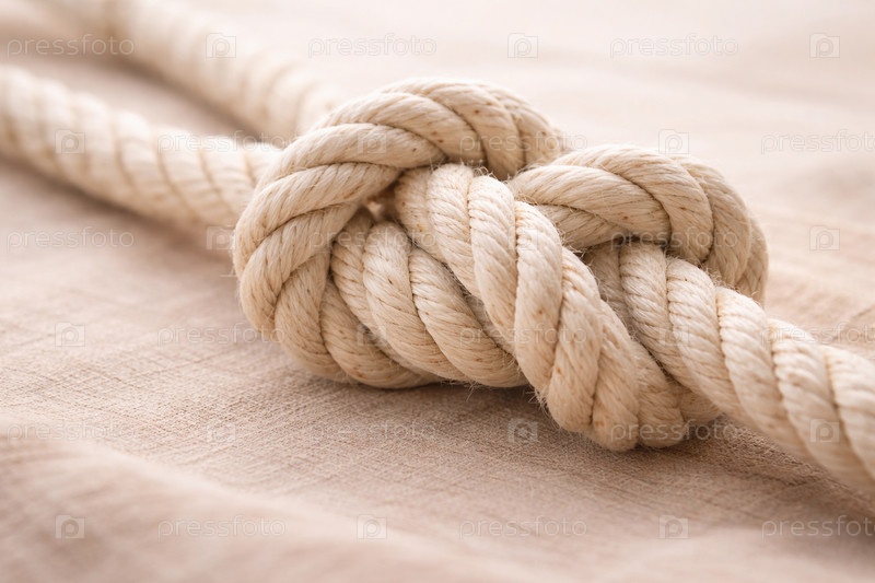 Натуральный бежевый канат с туго завязанным морским узлом на льняном фоне — крупный план текстуры и волокон
