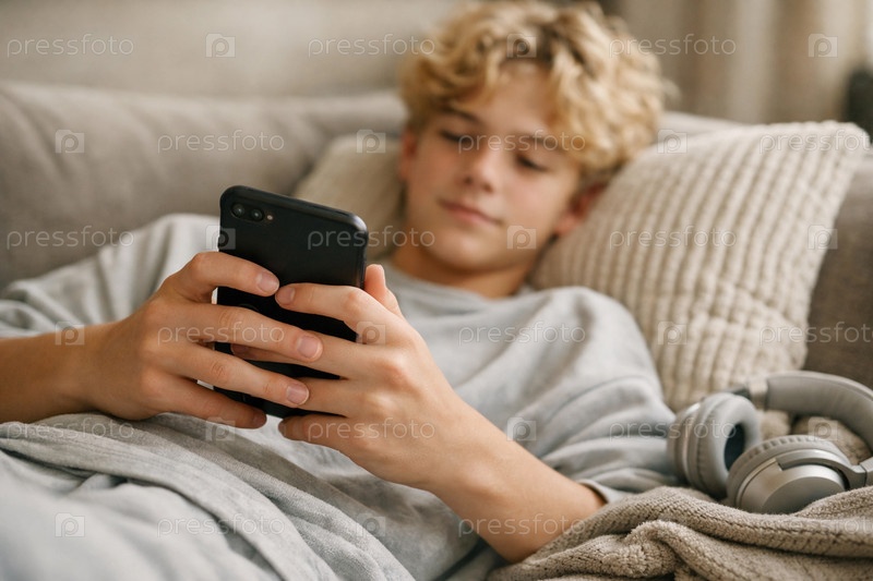 Подросток в уютном свитшоте отдыхает на диване с смартфоном, рядом беспроводные наушники и плед — домашний досуг и цифровые развлечения